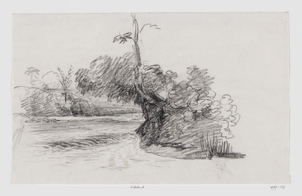 Curator: Welcome. We are looking at an etching titled "Banks of the Marne," created by Alphonse Legros. What's your immediate reaction to the piece? Curator: The etching has a delicate, almost wistful feel. The muted tones create a very serene, yet melancholic landscape. There is this interesting layering effect as we look from the river up to the trees. Curator: I think the choice of the river Marne as subject is really significant when considering the period in which Legros worked. Rivers throughout Europe were, and continue to be, critical yet contested spaces both economically and symbolically. In a moment of immense industrialization, a pastoral image offers an interesting commentary. Curator: I agree, there's a deliberate choice being made by the artist in the image, certainly. Focusing purely on its formal qualities, the composition leads your eye gently across the river towards the stand of wind-blown trees. There’s a clever balance between open space and detailed areas, directing the viewer's attention exactly where Legros wants it. Curator: Yes. And it is also hard to ignore that Legros, though born in France, lived and worked largely in Britain. Images of the French countryside may carry undertones of longing and alienation. We can consider themes of displacement, something crucial to the Impressionist project in general. Curator: True. The style definitely carries aspects of Realism that evoke some emotion. Notice how he uses these short, expressive strokes to convey movement, especially in the trees and water. They almost seem to shiver with a subtle, almost hidden energy. Curator: The etching feels quite subversive given its relatively small scale; it offers quiet commentary on environmental change. This feels extremely relevant to contemporary discussions around climate justice, echoing anxieties about what industrialization extracts. It also resonates with questions of nationalism; Legros was deeply involved in artistic circles where French and British identities mingled. Curator: Interesting! Seeing the image from an environmental point of view expands the formal perception. Regardless of his intention, Legros crafted something evocative here. Curator: Exactly. It's so important to see this as not just a landscape, but a subtle negotiation of complex issues. I will certainly reflect further on the dialogue.