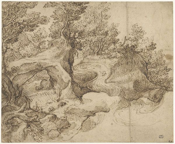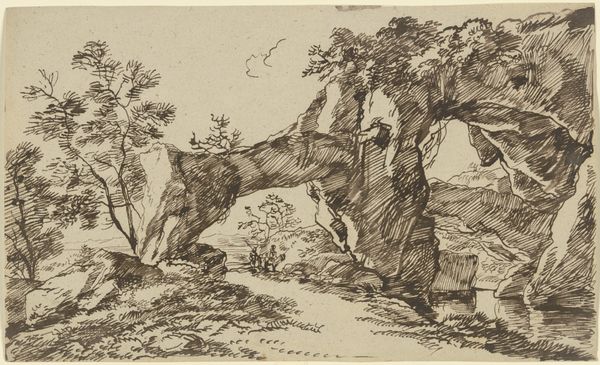 Franz Kobell captured this mountain landscape with steep rocks in a pen and ink drawing sometime between the late 18th and early 19th centuries. Kobell, born into a family of artists, was part of a generation navigating the shifting cultural landscape of Europe, influenced by Enlightenment ideals and burgeoning Romanticism. His detailed rendering of the natural world reflects the era's interest in landscape as a source of both scientific study and emotional resonance. Look closely to see how the rough lines of the rocks contrast with the soft foliage. The tiny figure of a shepherd with their flock is a humble reminder of humanity's place within this grand vista. A figure which is often overlooked, yet integral to the landscape itself. Did Kobell intend to celebrate the simplicity of rural life? Or to highlight the smallness of human concerns against the backdrop of an imposing natural world? Kobell's landscape invites us to contemplate our own relationship with nature, culture, and history.