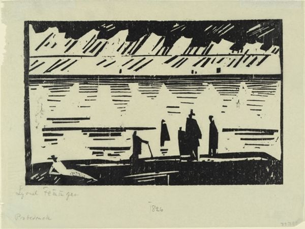 Editor: This is "Fishing Boats," or "Fischerboote," a woodcut print created in 1918 by Lyonel Feininger. The sharp geometric forms make me feel like I'm looking at fractured memories. How do you interpret this work, especially considering the period it was made in? Curator: This print is a fascinating example of German Expressionism during a turbulent time. World War I was raging, and artists like Feininger grappled with rapid social and political change. Woodcuts like this offered a relatively inexpensive and accessible medium for expressing these anxieties and questioning established artistic conventions. Notice how the simplified forms and stark contrasts create a sense of unease, reflecting a society grappling with the uncertainties of war. Does it remind you of any other art movements from that time? Editor: I see hints of Cubism in the geometric shapes and fragmented space, although it feels much starker and more emotionally charged. So, the simplification of form relates directly to societal anxieties? Curator: Precisely. Artists were questioning traditional modes of representation. Think about the role of the woodcut as a print medium - readily reproducible, available to the masses. This democratisation of art aligns with the social upheavals of the era, offering a powerful means of communicating dissent and capturing a fractured reality for wider audiences. Editor: That makes me think about how political art can be without overtly depicting political figures or events. Curator: Exactly! Art can engage in political commentary just by depicting society. And for a time of turmoil this woodcut represents its moment in time, for the generations to experience going forward. Editor: That’s a perspective I hadn’t fully considered. I'm glad I get to see it now. Thank you. Curator: My pleasure. Analyzing historical context truly illuminates artwork meanings, doesn’t it?