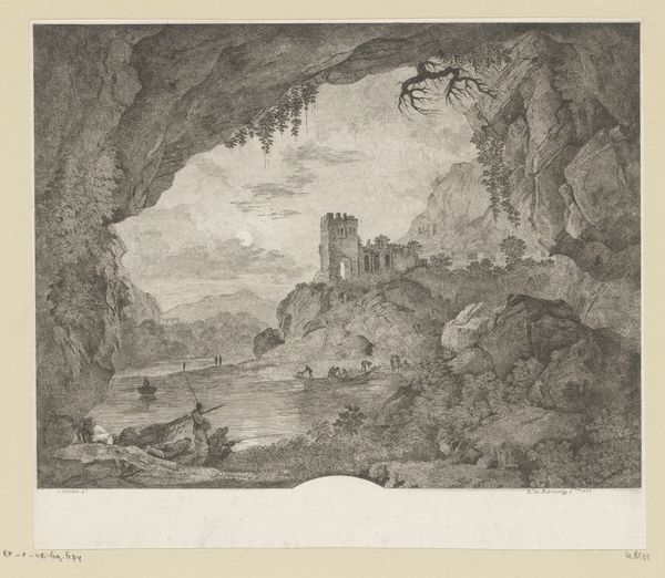 Editor: Here we have Joseph Fischer’s "Boating Party in an Underground Cave" from 1794, rendered in ink and engraving. It strikes me as incredibly theatrical, almost stage-like with its dramatic lighting. What draws your eye when you look at this piece? Curator: Immediately, I'm struck by the performative aspects inherent in the engraving process itself. Look at the deliberate choice of ink and engraving to depict this scene – a decision laden with socio-economic implications. Engravings were reproducible, disseminated widely. This begs the question, for whom was this subterranean gathering staged, and who had access to viewing its representation? What labor was involved in producing not only the party itself but also in its visual documentation? Editor: That’s fascinating! I hadn’t considered the reproduction aspect so deeply. So, the choice of engraving itself tells a story about class and access? Curator: Precisely! The materials – ink, paper, the engraver's tools – all speak to specific workshops and economies of production. Consider how the act of engraving translates the original event. It's a form of manual labor transforming one material (the artist’s original sketch, perhaps) into another (the reproducible print). How does this shift alter the "authenticity" or "value" of the scene represented? Was this meant to ennoble or elevate the person the engraving was dedicated to? Editor: I see, it makes me think about who had the resources for staging an underground party, and even more, commissioning the making and distribution of these prints! Curator: Absolutely! And further, who mined the materials, who made the inks? What power dynamics are involved at each step of this process? The “underground” aspects of not only the party but of material production, invite a stark awareness of the unseen labor necessary for artistic creation. Editor: Wow, I never thought about this image in those terms before, thinking of it as an active record of materials, labor, and class. It gives "art for art's sake" a whole new meaning. Curator: Indeed. And it's a reminder that every artwork carries within it the fingerprints – both literal and metaphorical – of its making.
