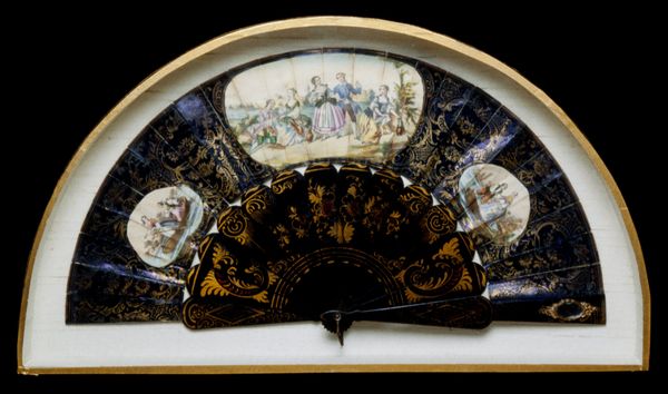 Editor: So, this is an intriguing object. It’s an anonymous, 19th-century French fan from the Minneapolis Institute of Art, a mixed-media piece with watercolor on paper. It definitely gives off a Rococo vibe. The details are incredible, but also kind of perplexing. What strikes you most about it? Curator: It's a fascinating collection of signifiers. The fan itself, of course, has long been a symbol of feminine power, secrecy, and flirtation. Consider how gestures with a fan created a whole language, encoding messages of availability and interest. Then we have these portraits… What do they tell us? Editor: I’m not sure, honestly. They seem almost generic, like idealized types rather than specific people. Curator: Precisely. And that central scene – a maritime gathering, perhaps a noble family embarking on a voyage? Water often symbolizes the subconscious, journey, transformation. Put these elements together, and what story is being told? Editor: Maybe a story about aspirations? These portraits of “ideal” people contrasted with a painting depicting the aristocratic ideal of leisurely voyages? Perhaps they represent status and success which someone aspires towards, hence a "fantasy," of sorts. Curator: Interesting perspective. Consider also the fragility of the medium itself. Paper, watercolor – easily damaged, easily lost. Does that fragility speak to the fleeting nature of beauty, pleasure, even power? Or perhaps is it commenting on the performative and ephemeral quality of such constructed personas and displays? Editor: That’s something to consider! So, by interpreting the fan in this manner, it stops becoming purely an aesthetic or material item and takes on meaning that comments on more meaningful elements that are culturally rooted. Thanks, I think I’m beginning to see what this cultural object really says!