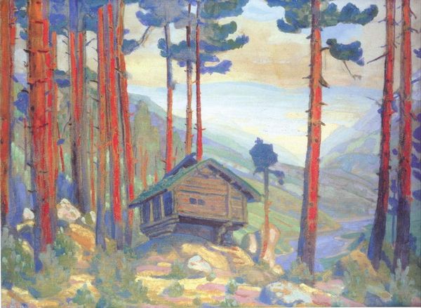 Editor: This is Alfred William Finch's "Landscape from Padasjoki," painted in 1917 using oil paints. The texture looks quite thick. It almost vibrates with all those bright colors. What do you see in this piece? Curator: Observe how Finch employs impasto techniques, building layers of paint to create a tactile surface. Note the division of space and how he juxtaposes foreground and background. Is there a coherent composition or a more fractured, deconstructed pictorial space? Editor: It seems balanced, but the brushstrokes feel really free, almost chaotic in places, especially in the trees. It's not a smooth blend of colors. Curator: Precisely. Consider how the visible brushstrokes articulate form and texture, departing from traditional modeling. The vibrant color palette serves not to replicate nature, but to create a visual rhythm, an interplay of tones. Do these color relationships adhere to conventional landscape painting, or do they disrupt established norms? Editor: They're definitely amplified. The reds of the buildings against the greens of the landscape – it's not subtle. It pushes beyond realism, almost into abstraction. Curator: Good. Notice the flatness of the picture plane. Finch isn't really creating deep space in the Renaissance sense; rather he's calling attention to the painted surface itself. How do we reconcile this with his apparent desire to capture the landscape? Editor: So he’s showing us the process of painting as much as the place itself? It’s a very self-aware landscape. Curator: Precisely. He reveals the underlying structure, challenging our perception of landscape as a straightforward representation of reality. It highlights the artistic choices and techniques inherent in constructing any image. Editor: I hadn’t considered how the visible brushstrokes and color choices directly question our expectations of landscape paintings. Curator: It underscores the active role of the artist, reshaping how we perceive both the artwork and the world it represents.