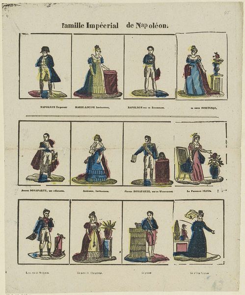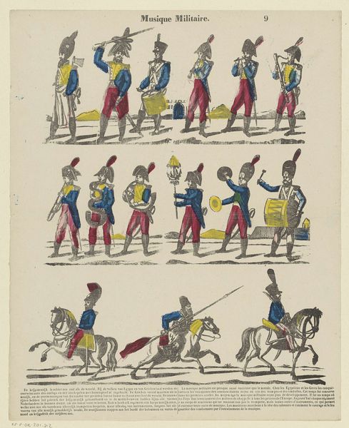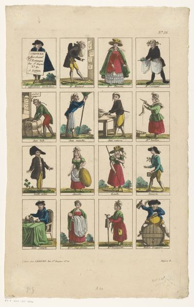 This print, Volkeren van verscheyde landgewesten / Habitans de diverses contrées by Glenisson & Van Genechten, presents rows of figures, each meticulously labeled to represent inhabitants from various regions. Rendered with delicate lines and a restrained palette of blues, yellows, reds, and browns, the composition is neatly structured into a grid, giving a sense of order. However, this structured arrangement belies a complex interplay of representation and categorization. The figures, while presented as distinct types, are homogenized through a uniform artistic style. This flattening raises questions about the power dynamics inherent in such visual categorizations. Do these images accurately reflect cultural differences, or do they impose a European perspective onto diverse populations? The use of color seems arbitrary, not necessarily corresponding to the actual garments or skin tones of the people depicted. This abstraction further complicates the print's claim to represent reality, inviting us to consider the semiotic codes at play and to decode the underlying structures of knowledge and power embedded within it. The image prompts a re-evaluation of how we perceive cultural identity and difference.