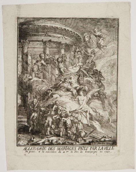 Gabriel de Saint-Aubin etched this allegory to honor the birth of the Duke of Burgundy. Note the cherubs and allegorical figures that fill the composition, set against a classical architectural backdrop. The image's power resides in its layered symbolism. Winged figures offering garlands echo ancient Roman triumphs, resurfacing in Renaissance art to denote victory and divine favor. Garlands, initially symbols of honor, weave through time, signifying celebration in various forms. Observe how the swirling clouds and dynamic figures evoke a sense of movement. This recalls the Baroque era's emotional intensity, engaging viewers on a visceral level. The artist taps into our collective memory, resonating with subconscious associations. Consider the wheel, a symbol of fortune, present since antiquity, which has ebbed and flowed through diverse cultural contexts, taking on varied meanings. This emblem is a testament to the cyclical nature of symbols, resurfacing and evolving across history.