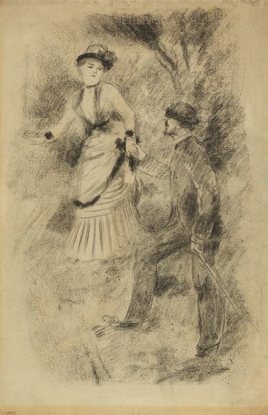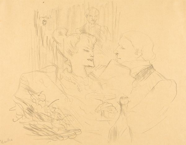 Henri de Toulouse-Lautrec made this sketch, "Brandes and Leloir in Cabotins," capturing a moment in Parisian theatrical life. Toulouse-Lautrec, though an aristocrat by birth, was drawn to the marginalized figures of Montmartre, including actresses like Brandes and Leloir. The sketch offers a glimpse into the social dynamics of the late 19th century, where the stage was a space for women to gain visibility and a degree of independence, though within the constraints of societal expectations. Brandes's confident gaze contrasts with the more formally dressed Leloir, suggesting a complex interplay of power and performance. Toulouse-Lautrec often blurred the lines between observer and participant, and his empathetic yet critical eye captured the nuances of identity and class in the entertainment world. The work invites us to consider the roles these women played, both on and off stage, and how they navigated the complexities of their era. In the context of Toulouse-Lautrec's oeuvre, this sketch reflects his ongoing fascination with the human condition, rendered with both intimacy and social awareness.