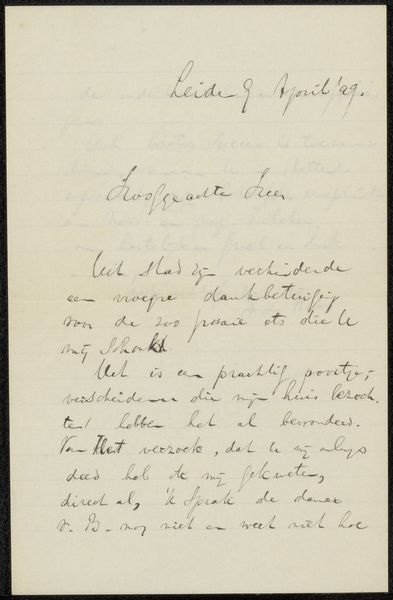 Editor: Here we have "Brief aan Philip Zilcken," created before 1899 by Baronne Madeleine Deslandes. It's a personal note, it seems, in ink on paper, almost like glimpsing into the artist’s private correspondence. It’s incredibly intimate in its simplicity. What draws your eye to this piece? Curator: Ah, it whispers secrets, doesn't it? The handwriting itself is a character, a sort of elegant slouch across the page. I'm immediately struck by its fragility. Consider: here is a physical object carrying sentiments across time. Can you almost feel the weight of those unrecoverable moments pressing down even now, more than a century on? I wonder what "amoi d' Stoffe" was that she references toward the end? Editor: That’s lovely. I hadn’t thought of the actual physical presence carrying that weight. "Amoi d' Stoffe"... fabric? Perhaps a gift? Curator: Quite possibly. See how the casual quality belies its intentionality, in a sense making its artistic "statement" even more bold. Each stroke of ink, quick or deliberate, becomes a window into her mind, an unfiltered expression of daily thoughts. Look closely at how the writing both reveals and obscures; like looking into someone's soul. Editor: So, even a simple note becomes a portrait, of sorts, in the same way her style, more broadly, would depict portraits. I see now. Curator: Exactly. A reminder that art isn’t just in grand statements. It's woven into the very fabric of living. Editor: It makes you appreciate those smaller expressions of ourselves.