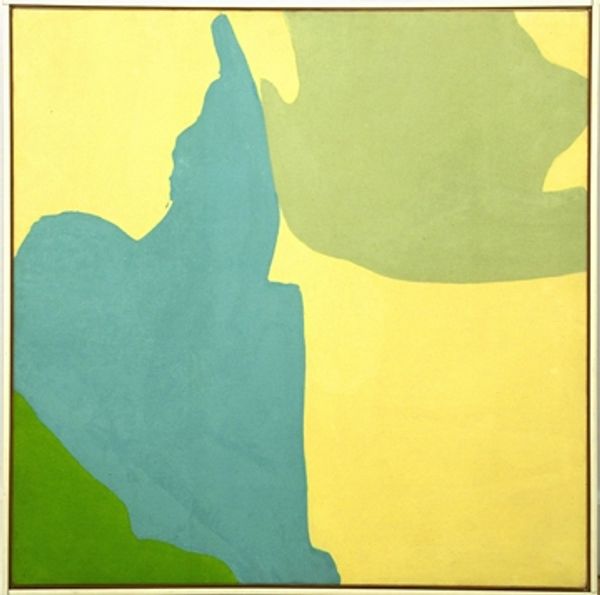 Curator: Welcome. Here, we have Helen Frankenthaler's "Interior Landscape" from 1964, now residing at SFMOMA. Editor: My immediate impression is of fluid shapes contained—almost trapped—within a bold geometric framework. The colors vibrate against each other, a visual tension between control and freedom. Curator: Frankenthaler, working within Color Field painting and Abstract Expressionism, frequently challenged conventional artistic boundaries. The "soak-stain" technique, here applied with acrylic, allowed her to merge color and canvas, creating a unified surface. Considering this was 1964, what does this abstraction tell us about landscape art at the time, its departure from tradition? Editor: It's a complete rejection of pictorial depth and illusionism. Look at the almost jarring juxtaposition of the bright blue, the vibrant yellow frame, and the deeper, brooding tones around it. The "landscape" exists solely as an experience of color and form. Curator: I think you make an excellent point, considering her role in second-wave feminism; do you think there is a potential reading of gender within the work? How could the fluidity that defines the stain technique stand in contrast to male contemporaries' artworks? Editor: It's a softer approach, yes. Less about aggression and more about permeability and allowing forms to emerge rather than forcefully imposing them. But at the same time, her work is not just quiet and retiring, you know? The confidence here cannot be overstated. Curator: Definitely, you could never accuse her of such a lack of confidence; perhaps her practice is a reflection of second-wave feminism's complex demands on gender roles? Editor: Her process dismantles traditional hierarchical composition. The canvas becomes an arena of pure experience—sensuous and immediate. There's also an undeniably intellectual aspect—a negotiation between chance and intentionality. Curator: A powerful synthesis, then, of historical and contemporary artistic impulses; thinking about her influence, and that dialogue between her painting and other media. Editor: A powerful and compelling dialogue for today's visitor.