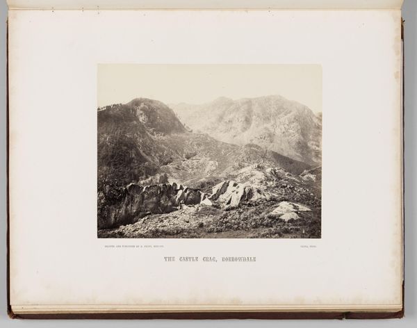 Curator: Francis Bedford's "Coast View, Ilfracombe, North Devon" is a fascinating example of early landscape photography. The stark contrasts immediately strike me. It feels like a Romantic-era painting, but rendered in shades of gray. Editor: Curator: Indeed. The image is mounted, small, and intimate, yet evokes a vast, rugged landscape. Bedford was a commercial photographer. How might the economics of photography shape this representation of the British coastline? Curator: I see a symbolic layering. The jagged rocks in the foreground speak of nature's power, a visual language common in landscape art, while the softening mist hints at the sublime. Editor: Perhaps the ruggedness catered to a specific consumer interested in the picturesque, a market Bedford was clearly catering to. It's a packaged vision of nature as a commodity. Curator: Perhaps. Ultimately, it is a powerful visual record, full of enduring symbols. Editor: Yes, a record shaped by its time, production, and intended audience. Food for thought.
