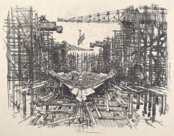Curator: Joseph Pennell created this etching, titled "Building Destroyers, No. I," in 1917. What are your initial thoughts? Editor: It feels incredibly frantic and unsettling. There's a chaos in the lines, a sense of immense, almost overwhelming construction. Is it supposed to represent a positive vision of progress, or is there something more ominous at play? Curator: Considering the date, 1917, amidst World War I, it's difficult to separate it from the atmosphere of the time. Pennell, as an artist deeply engaged with his socio-political context, likely intended to convey the frenzied, almost desperate pace of wartime shipbuilding. These weren’t just ships; they were instruments of destruction. Editor: Exactly. Looking at it through that lens, it’s impossible to ignore the implied violence. The angular lines, the sheer scale of the cranes, they all seem to contribute to a visual representation of industrial warfare and masculinity. Are there other works from this period by Pennell? Curator: Absolutely. He made several lithographs and etchings that portray the rapid industrial expansion and military build-up during the war. Pennell often explored the intersection of industry, labor, and national power. You see how the cityscapes turn into almost surreal, oppressive environments. The human figure is dwarfed or completely absent, suggesting individual powerlessness in the face of industrial might. Editor: And that complete lack of human presence makes the print even more chilling, I think. We’re left with these cold, impersonal structures rising skyward. This raises crucial questions about the relationship between technological advancement, masculinity, and warfare, particularly during periods of intense social upheaval. Pennell isn’t merely documenting progress, he's exposing its potential cost, which becomes so central in interwar reflections. Curator: Indeed. And his chosen medium, etching, is quite effective in conveying this message. The sharp lines, the tonal contrasts, all heighten the dramatic effect, contributing to this atmosphere. So the style echoes modernism, but serves documentary purposes, and political expression. Editor: Well, I appreciate having a closer look and situating this work within a wider social framework. Thank you! Curator: My pleasure! Understanding the political and historical backdrop allows for a richer engagement with Pennell's vision.