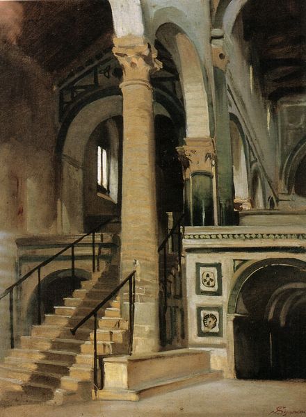 Editor: This painting, "Glimpse of the Monastery of Florence" by Vincenzo Abbati, looks like an oil painting and presents an architectural view. I am struck by the contrast between light and shadow and the figure of the monk seemingly absorbed in reading. What can you tell me about it? Curator: Well, the choice of subject is interesting. It invites reflection on power structures, right? Monasteries, historically, were centers of knowledge and influence, but also exclusion. Who had access to that knowledge? Whose voices were silenced within those walls? And this lone figure – is he empowered by his access to scripture, or is he trapped within a system? Editor: That's interesting, I had not considered the role of knowledge. Are you suggesting that Abbati is critiquing the Church? Curator: Not necessarily, but consider the socio-political climate. The painting offers us a visual window into a very particular space, inviting contemplation not just of the scene but of its relationship to the broader societal structures of the time. And notice the light—how it falls unevenly, illuminating some areas while obscuring others. Who is in the light? Who remains in the dark? Editor: That makes me see the painting in a different way. The monk being partially obscured in shadow now carries new weight. Curator: Exactly. And what does it mean to glimpse a monastery, rather than see it fully? What does it hide from our sight and what is revealed to us? Editor: This has really made me reconsider how the context of a painting changes how we see the image. Thank you. Curator: My pleasure. It is exciting to discuss how history and societal powers affect even this 'simple' scene.