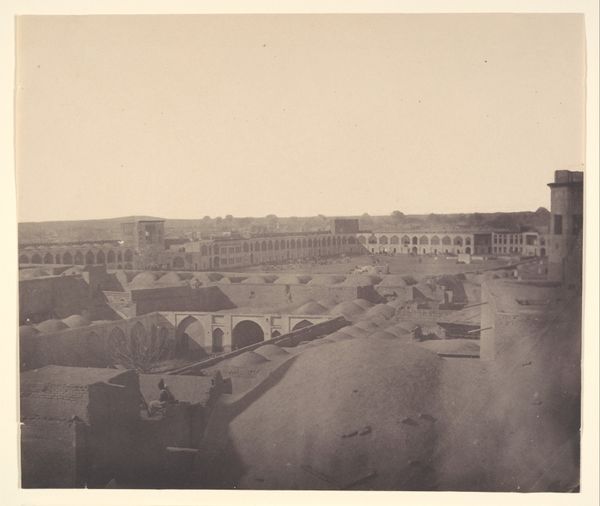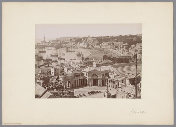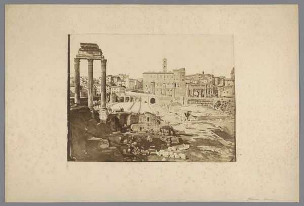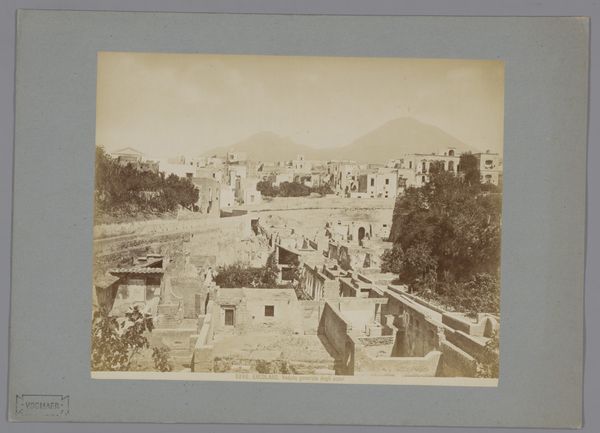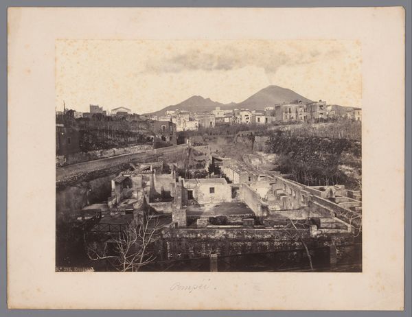 Curator: Roberto Rive’s gelatin silver print, "Herculaneum, Pompeii", circa 1880, captures the stillness and sorrow of a lost city. It's a fascinating cityscape from the late 19th century currently held in the Rijksmuseum collection. Editor: What strikes me immediately is the photograph's tonal range. The sepia wash lends it a distinctly nostalgic affect and, of course, an air of timelessness, given its subject matter. I'm also drawn to the lines--vertical in some places and horizontal in others. It creates an amazing composition and directs your eye into the picture plane. Curator: Indeed. Rive, working in the 19th century, was clearly responding to the expanding Grand Tour phenomenon, the surge of upper-class travelers eager to witness ancient ruins. Photography was essential in popularizing archeological sites, allowing viewers around the globe a tangible link to these lost societies. Think how significant it would be to see such detail of Pompeii, for the first time, especially if one were unable to travel. Editor: I’m struck by the emptiness. The frame is carefully considered and contains some pedestrians—visitors, I assume—yet the focus remains relentlessly on architectural form. The framing of walls against the dark slopes really makes it a unique image and composition. Curator: Right, it becomes a somber reflection on temporality, on history itself. This photograph exists, after all, because of destruction, of a singular moment of devastation that nonetheless preserved an entire urban culture. Photography offered both evidentiary detail, and a memento mori of sorts. Editor: Exactly, and there is something almost ghostly in this still image of Pompeii frozen in time; it invites meditation on both its rise and cataclysmic fall. Rive captured not just a city but also its absence, an emptiness filled with resonant historical weight. Curator: Well put. Ultimately, Rive's work presents an enduring vision. While providing a tangible link to antiquity for its viewers, it invites an exploration of what survives and how we commemorate, and ultimately mourn, civilizations of the past. Editor: A photograph then that shows us something of our place, here and now, in an unfolding, never ending cycle of civilizations rising, and civilizations declining. Thank you.