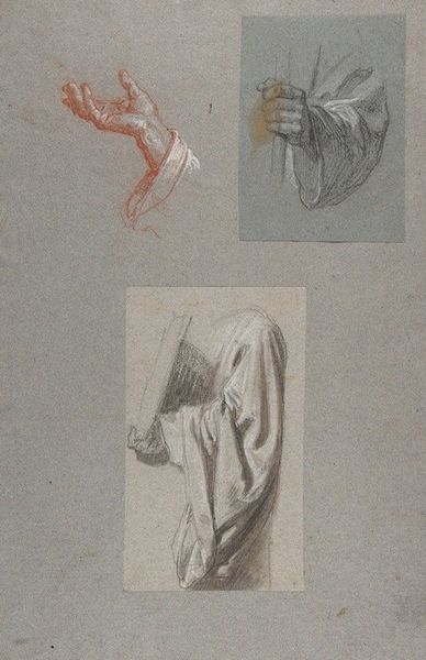 Editor: Here we have Henri Lehmann's 1863 pencil drawing, "Study for the figure of Sarah in the now-lost painting,Tobias Brings His Bride Sarah to the House of His Father, Tobit." It feels unfinished and ethereal, like a memory fading into the grey paper. What do you see in this piece from a formal perspective? Curator: The composition immediately directs the eye upward, doesn’t it? The almost hesitant lines coalesce to suggest a figure reaching, perhaps beseeching. Notice how the drapery, though fragmented, isn’t merely ornamental; it articulates the planes of the body beneath. The tonal contrasts, while subtle, are crucial. Editor: I see that, especially around the face and the folds of the gown. Is that contrast deliberately highlighting her vulnerability, perhaps? Curator: Vulnerability may be a reading we can derive, however the artist’s attention to line and form are noteworthy. Observe the angularity of her elbows in opposition to the soft curve of her neck; this generates a tension within the figure itself. Further note how Lehmann used the pencil medium to achieve various effects. Where can you see hatching techniques used to show shading and light? Editor: The shading is softer toward the bottom of the dress. I also see it's quite dense on the arm to her left and along her back. The quick, short strokes on the drapery falling from her outstretched hand feel different too, more energetic. What does the contrast in stroke work suggest? Curator: A visual tactic that contributes to our engagement, does it not? The difference in application accentuates specific formal relationships while also adding textural interest to a rather spare study. A keen student will be aware of that intentional relationship! Editor: That's a perspective I hadn't considered. It's fascinating to see how much can be gleaned from a piece even when removed from its intended historical context, by only analyzing the lines, strokes, and how the composition leads our eye through the picture plane. Curator: Precisely! Focusing on what is manifestly present will always afford opportunities to deepen one’s appreciation for the visual language of any art form.