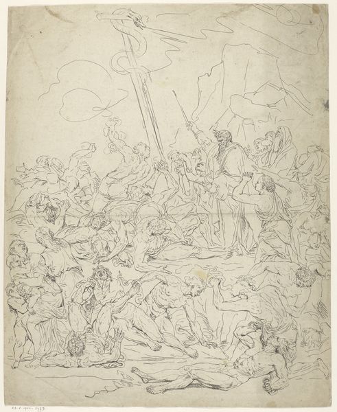 Curator: Before us is Mario Cartaro’s engraving, “Martyrdom of Saint Catherine of Alexandria,” created around 1567. The delicate lines suggest a complex and, quite frankly, violent scene. What’s your initial response to the composition? Editor: Stark, definitely stark. The light seems almost to isolate Catherine. You immediately understand she's the focus, but it is framed through carnage. The way Cartaro composed this seems intended to force the viewer to question authority. Curator: Indeed, there's a distinct separation created by light and shadow, particularly in how the artist utilizes the figures. The diagonal line of action, originating from the divine intervention above and cutting through the broken wheel to the fallen figures, it creates a clear visual hierarchy, doesn't it? It almost feels choreographed to draw our gaze. Editor: The figures around her seem deliberately posed, theatrical almost, but the horror is undeniable. Saint Catherine wasn’t just defying imperial power, but also gender norms of the time. This feels less like a passive acceptance of fate, and more an active rejection of oppression. Curator: True, one can see how Cartaro is employing classic compositional techniques—triangular arrangements, idealised forms—but his mannered, even stylized, rendering gives the image a decidedly dramatic flare. Editor: And let’s not ignore the role the medium plays. This is an engraving—mass produced. This martyrdom becomes a spectacle of resistance, one disseminated to challenge established orthodoxies and provide women of the era with an image of heroic defiance. Curator: I agree the printmaking certainly allowed wider distribution of such imagery. This makes the narrative about her strength far reaching beyond the church walls. What an outstanding look at structure and social messaging! Editor: Absolutely. I’ll be thinking about Catherine for a while. Thank you for offering such keen formal and conceptual insights, together the piece unlocks potent new meanings for today.