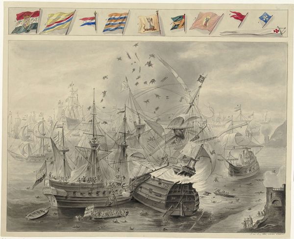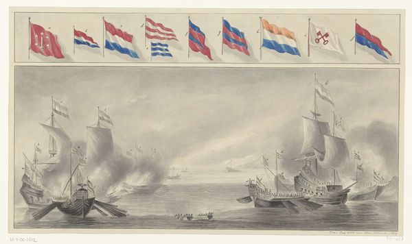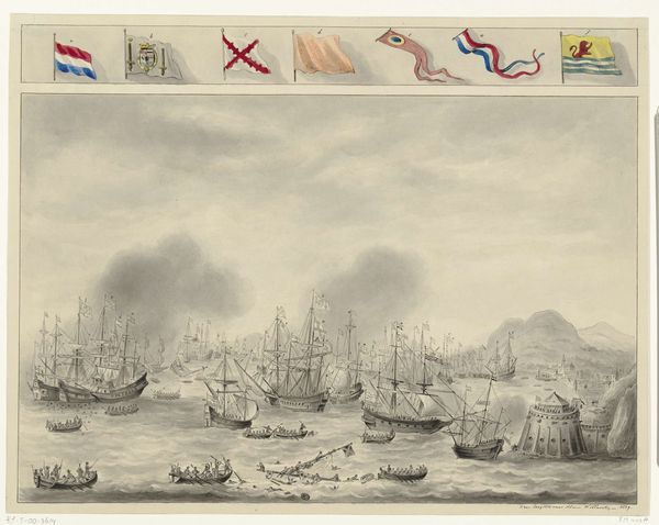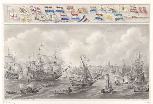 Pieter van Looy created this delicate pen and brush drawing of the arrival of the Earl of Leicester at Vlissingen, in 1885. The grey wash drawing on paper depicts ships at Vlissingen, festooned with flags, and the significance of this artwork resides in the ways its materials and method narrate a complex history of labor, politics, and consumption. The artist's meticulous approach and restrained palette evoke a sense of precision. Note how the detailed rendering of the ships and flags would have required both technical skill and considerable time, underscoring the value placed on craftsmanship. By employing traditional drawing techniques to depict a scene of international diplomacy, the artist invites us to consider the intersection of art, craft, and historical narrative, reminding us that even seemingly straightforward depictions can be rich with layers of meaning and social context.