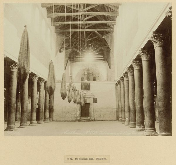 Médéric Mieusement captured this photograph, Zuilengalerij in het stadhuis van La Rochelle, using a gelatin silver print. The arcade's repetitive structure, emphasized by its rhythmic series of columns and arches, draws the eye into a seemingly endless depth. The sepia tone evokes a sense of timelessness, highlighting the intricate details of the coffered ceiling. Mieusement's photograph prompts us to consider how architectural spaces are not merely functional but are also deeply symbolic. The arcade, with its converging lines and repeating shapes, acts as a visual metaphor for continuity and passage. The texture, visible in the stone and shadows, creates an interplay of light and dark that enhances the dimensionality of the print. The play of light and shadow across the columns and arches gives rhythm and structure which reinforces the idea of architecture as a series of signs encoding power, history, and cultural values.
