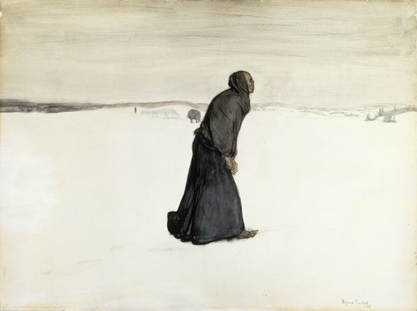 Curator: This evocative work is entitled "Kontemplace, Mnich na mořském břehu", which translates to "Contemplation, Monk on the Seashore." It's an oil-paint by Jakub Schikaneder. What strikes you about it? Editor: Immediately, the monochrome palette creates such a pensive mood. The rough brush strokes, the cold and fading sky all contribute to an overall atmosphere of existential loneliness, one the single human figure seems to embrace completely. Curator: Precisely. Painted during a time of immense social and political upheaval, this solitary monk figure embodies a turn towards inwardness and the search for personal meaning. How do you see his role within this socio-political context? Editor: Well, that isolation seems entirely self-imposed; this isn't a depiction of a society shunning someone. The figure seems at peace with his loneliness and isolation. Is the use of rough brush strokes a comment on how artists working during moments of great shift begin turning towards a focus on interior experience rather than a desire to represent anything resembling outward “realism?” Curator: Absolutely. It is important to notice how romanticized ideals such as solitude, combined with subtle atmospheric effects like the impending sunset, highlight Schikaneder's exploration of emotional states rooted in disillusionment with external reality. Editor: The monk's posture also invites introspection, he looks completely self-contained in his cloak of faith; arms folded tightly as if literally sheltering his own being. I must admit my interpretation is entirely limited by a purely formalist perspective. Do we have any insights as to how a 19th-century audience would react to it? Curator: Many perceived this type of isolated figure within an austere, minimalist seascape as both representative and reflective of personal feelings of alienation arising due economic disruption and political unrest common in Schikaneder's historical moment, making this, perhaps unintentionally, into an overtly social art. Editor: It seems in spite of the self-contained figure being, there are more narrative layers than the eye can initially capture; which makes this simple visual paradox fascinating on both interpretive levels. Curator: Agreed. Considering both social context and individual response enriches the complexity within this seemingly serene landscape. Editor: Absolutely; an investigation across disciplines allows a deeper, wider resonance and appreciation for its impact on its time.