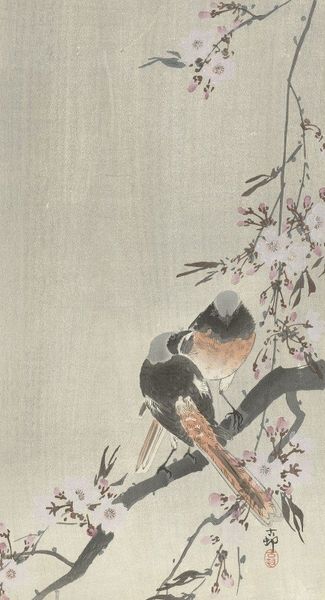Curator: Look at this charming woodblock print, probably dating between 1925 and 1936, called "Two great tits at blossoming tree" by Ohara Koson. Editor: My initial impression is of peacefulness. The soft color palette and delicate details evoke a sense of calm and a connection to nature. Curator: Exactly. The Ukiyo-e tradition, from which this work emerges, often explores themes of nature, beauty, and the fleeting moments of everyday life. It’s difficult to view such images without being reminded of the gendered labor that circulated throughout the system, where men were largely responsible for production and dissemination. However, women worked behind the scenes. In fact, gender, and other identities, also came into play within representations of actors in relation to patrons, too. Editor: From a formal standpoint, the composition is interesting. The stark contrast between the light sky and blossoming tree grounds our attention. The dynamic lines of the branches contrast with the small falling flower petals, creating visual interest. It evokes a sense of movement, doesn't it? The positioning of the birds further enhances this dynamism. Curator: Absolutely. Koson was known for his depictions of birds and flowers, which aligns him with broader cultural narratives connecting to avian imagery of freedom, delicacy, and transient existence in Asian artistic traditions. These motifs, like cherry blossoms and certain bird species, possess symbolism intricately woven into social dynamics and spiritual beliefs. These symbols act as signifiers related to class, wealth, morality, and also ideas about transience. Editor: It’s interesting how Koson simplified natural forms into shapes. Looking at how the leaves are rendered with crisp edges, it makes me appreciate his mastery of form. It creates a compelling and pleasing abstract quality. Curator: Thinking of the historical context of Japanese art during that era makes me realize how this art both conforms and challenges assumptions related to cultural identity and imperialist expansion at the time. We could read this print, for example, as speaking to an idyllic vision of a nation or region. Editor: Ultimately, this piece shows Koson's skillful observation and artistry. The strategic use of color and line draws the viewer in and showcases his intimate knowledge of avian subjects. Curator: Yes. The beauty lies, perhaps, in how Koson captures a tiny vignette of ecological life while quietly referencing complex social narratives related to nature and symbolism.