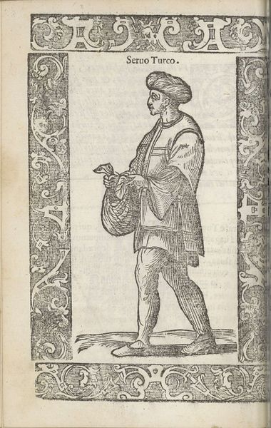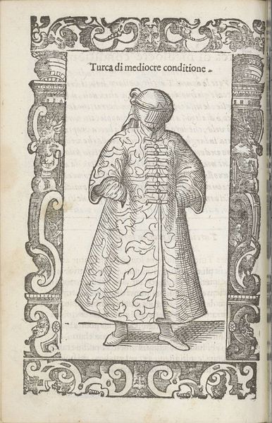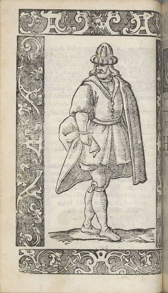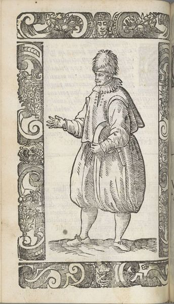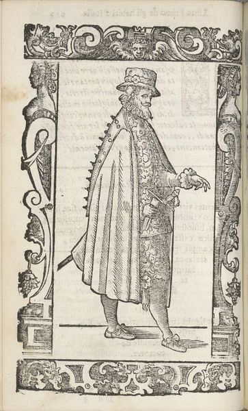 Curator: This ink and pen drawing, titled "Franchese", was crafted by Christoph Krieger in 1598. It presents a rather stately figure, wouldn't you say? Editor: It strikes me as very controlled, even rigid. The figure seems self-conscious, as if aware of being observed, meticulously etched on what looks like a fragile piece of paper. I’m intrigued by how the textures are constructed purely through line work. Curator: The detail in the attire is indeed remarkable. Note the ruffled collar, the meticulously rendered cloak. Each line contributes to a symbolic representation of status and refinement. What do you make of the bordering decorations, crawling with monstrous, pagan-like faces? Editor: Those borders draw my attention to the printing process, making the labor very present, yet impersonal. The uniformity implies mass production. It makes you wonder about the intended audience, and the social climate that allowed for such accessible depictions of the wealthy. What did prints mean in 1598? Curator: The availability of prints expanded access to information and imagery, yes, but also perpetuated particular notions of class, lineage, and morality. Here, the individual is literally framed by allegorical creatures and stylized ornamentations which root the figure into a recognizable and symbolic cultural landscape. The composition and surrounding motifs reinforce the man’s societal place, making a statement that could be interpreted in a variety of ways. Editor: Precisely! The materials used, humble though they seem – ink and paper – actually grant this “Franchese” access to a wider audience, circulating an idealized image for both admiration and potential consumption. It really challenges traditional art boundaries. The fact that something reproducible would become a carrier for such specific and valuable societal meaning shows something in the work itself. Curator: I concur. While mass-produced, each copy likely held distinct emotional resonance for its owner. This work bridges personal identity and shared cultural ideals, a dynamic I always find particularly compelling. Editor: The contrast between the individuality portrayed, with its detailed costume and careful shading, versus its potential mass circulation is what keeps me fascinated with the intersection of class, access, labor and symbolic depiction here.