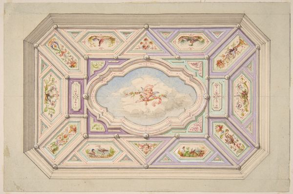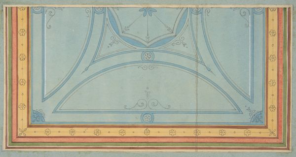 This is Jules-Edmond-Charles Lachaise’s “Ceiling design for a house on the rue Velezai,” an architectural drawing in watercolor and graphite. Immediately, the composition strikes one as rigorously structured, yet delicate in its pastel hues. The artist employs curvilinear forms within defined geometric boundaries to give us a sense of an interior architectural space. The visual experience evokes a feeling of lightness and airiness, typical of interior decoration. The visual structure mirrors 19th-century interests in ornamentation as a signifier of social status and cultural refinement. Lachaise's meticulous lines and balanced arrangement reflect not just a functional design but a statement on domestic aesthetics. Symmetrical patterns and motifs, arranged in layers, create a complex interplay of positive and negative space. The intention is to transform an ordinary ceiling into a canvas for art. Ultimately, the piece demonstrates how design functions as a cultural language. Through careful attention to detail and the structural integrity of the composition, Lachaise offers a ceiling design and prompts us to consider how architectural spaces shape our perceptions and values.