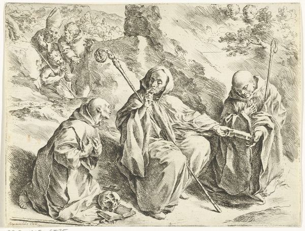 Simone Cantarini made this print, "Rest on the Flight into Egypt," in the 17th century. The image is created through etching, a printmaking technique that relies on acid to bite lines into a metal plate, which is then inked and pressed onto paper. The real beauty of etching lies in the artist's control over line quality. Cantarini uses dense, cross-hatched lines to create deep shadows, giving the figures a sense of volume. Notice how the lines vary in thickness, adding to the dynamic feel of the composition. This precise work requires skilled labor and an understanding of material properties. Prints like these were relatively affordable, meaning the image of the holy family would have been accessible to a wide audience. The act of reproducing and distributing images played a vital role in spreading both religious and artistic ideas. By understanding the materials and processes, we gain a deeper appreciation for the work involved and its wider cultural impact.