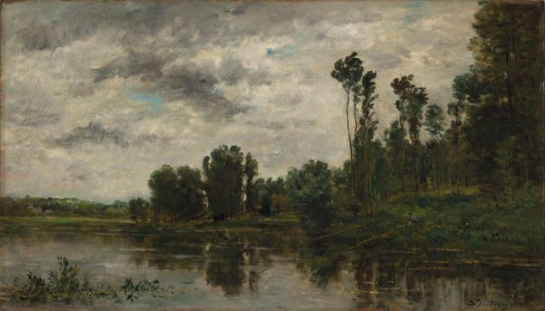 Editor: We’re looking at "Landscape in Stormy Weather" by Charles-François Daubigny, painted around 1865. It’s an oil painting, and the first thing that strikes me is the somber mood. All that gray! How do you interpret this work? Curator: This painting offers a glimpse into the evolving role of landscape within 19th-century French society. It's interesting to consider how the rise of industrialization influenced a romanticized yearning for rural simplicity. Daubigny captures this tension, doesn't he? The encroaching storm mirrors the social anxieties of the time. How does this piece resonate with our contemporary climate anxieties? Editor: That's interesting. I hadn’t thought about the storm as a symbol of broader social anxieties. I was just focused on the purely aesthetic qualities of the painting. Curator: Exactly. It encourages us to reflect on the connection between lived experience and representation, questioning the social frameworks through which we view art. Did landscape painting have the potential to affect social reform? And, who had access to it? Editor: It’s eye-opening to consider landscape art beyond just pretty scenery, seeing it as a reflection of social anxieties. Thanks for sharing your insights. Curator: It also challenges us to question whose stories are prioritized. Exploring Daubigny's piece through the lens of ecological justice offers a relevant perspective on environmental struggles across diverse communities. I have also gained new insight through your perspective.