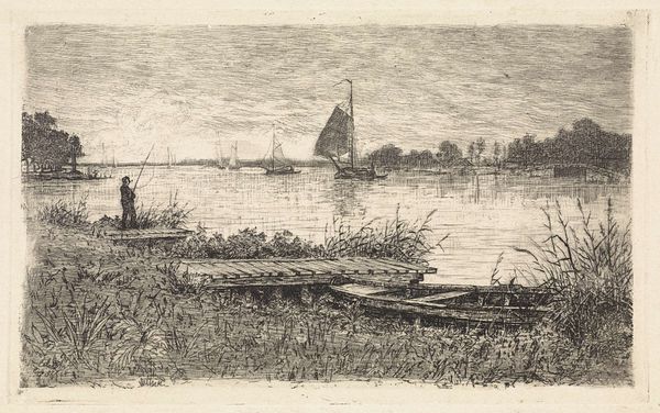 Editor: This is "Hurlingham," an undated etching by James Abbott McNeill Whistler, currently residing at the Harvard Art Museums. It's quite delicate, with fine lines creating a hazy, almost dreamlike quality. What do you see in this piece? Curator: The composition is rigorously structured. Note the delicate balance between the solid forms of the boats and buildings and their ethereal reflections. It emphasizes the interplay between surface and depth. How do you perceive the artist’s use of line? Editor: I see a lot of variation – some lines are scratchy, others are smooth, giving a sense of movement to the water. Curator: Precisely. Whistler masterfully exploits the inherent qualities of the etching medium, showcasing line as a tool for both representation and abstraction. Editor: That’s a great point; I never really thought about the line work in that way. Curator: Paying attention to an artist's use of line can give so much insight.