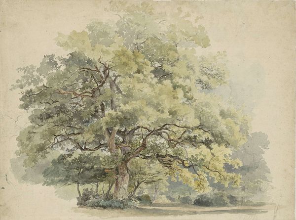 Curator: "A Great Tree," crafted around 1796 by J.M.W. Turner, employs watercolor and oil to conjure this striking landscape. Editor: It's brooding, isn't it? All tangled branches and stormy grey hues. Makes me feel like curling up with a good book on a rainy afternoon. Though, knowing Turner, there’s more than meets the eye with the weather, or a grand oak, wouldn’t you say? Curator: Indeed. The composition itself warrants close inspection. Notice the way the tree dominates the pictorial space, its gnarled limbs reaching across almost the entire field. And the use of aerial perspective—observe the subtle tonal variations which create depth, conveying spatial recession into the hazy distance, typical of the sublime landscape. Editor: Sublime indeed, as in…makes you contemplate existence under something vast? I think it almost makes me uncomfortable. I mean, it dwarfs those tiny figures near the base, practically hiding them under the trunk as though this ancient oak will turn sentient and just eat ‘em alive one day! Curator: One could analyze this as a visual representation of the Romantic ideal; it encapsulates nature’s power—that awe-inspiring, humbling force juxtaposed against the ephemeral nature of human existence. The brushstrokes aren’t just rendering branches but evoking feelings, yes? The textural nuances simulate movement within the seemingly static landscape. Editor: Right. Texture...makes me think of an old man's weathered hands, you know? Telling stories of survival. The colors—that almost monochrome palette broken by fleeting shades of ochre. Is that like a secret life force hinting within a dying form? Dramatic question—sorry! But does it mirror something larger, like human resilience within an ever-changing and potentially cruel world? Or maybe Turner was just really feeling gray one day. Curator: Haha, perhaps. Regardless, by examining its formal structure – the dynamism of line, the modulation of light and shadow – we grasp Turner’s mastery in visually articulating something beyond representation: something about feeling and our small space in a very big universe. Editor: Exactly! This is so much more than “a great tree.” It's like peering into our mortality through the lens of nature... pretty morbid way of saying I like it! I might go plant one now—if only to ponder this some more in 50 years or so.