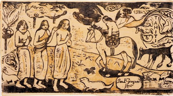 'Change of Residence' is a woodblock print made by Paul Gauguin, probably in the 1890s, during his time in Tahiti. Though seemingly simple, the process of woodblock printing is actually quite laborious. Gauguin would have used gouges to carve his design into a block of wood, and then applied ink to the surface, finally pressing paper against the block to transfer the image. The stark contrast between light and dark and the rugged texture come directly from this process of carving and printing. The imagery evokes a sense of exoticism and displacement: figures from Tahitian life alongside the word "Tahiti", and a man riding a horse, perhaps an outsider arriving or departing. Woodblock prints like this one were made in multiples, which meant they could be distributed widely and sold at relatively low prices. This allowed Gauguin to disseminate his vision of Tahitian life to a broad audience, while also earning a living. Ultimately, Gauguin’s prints challenge traditional notions of fine art by embracing both the aesthetic and the accessibility of the craft tradition.