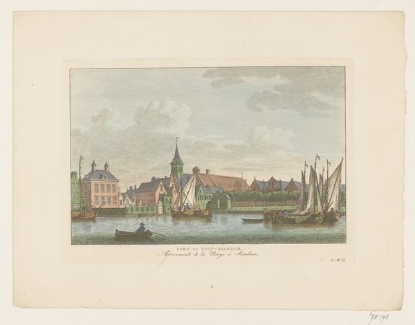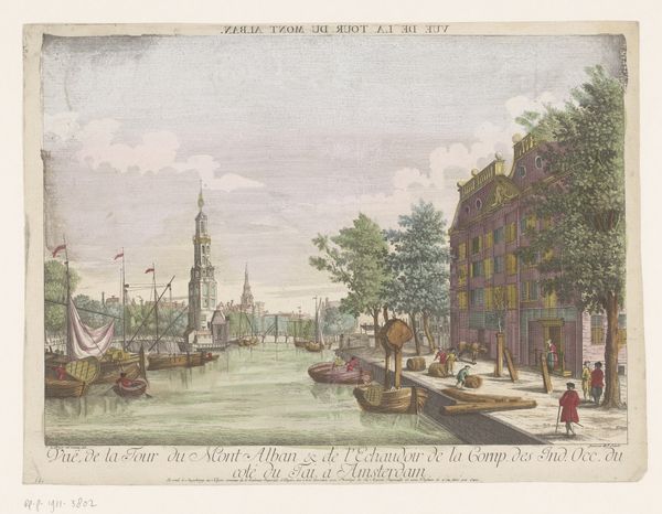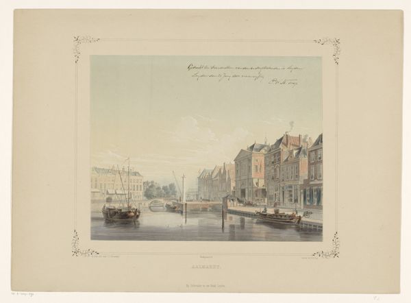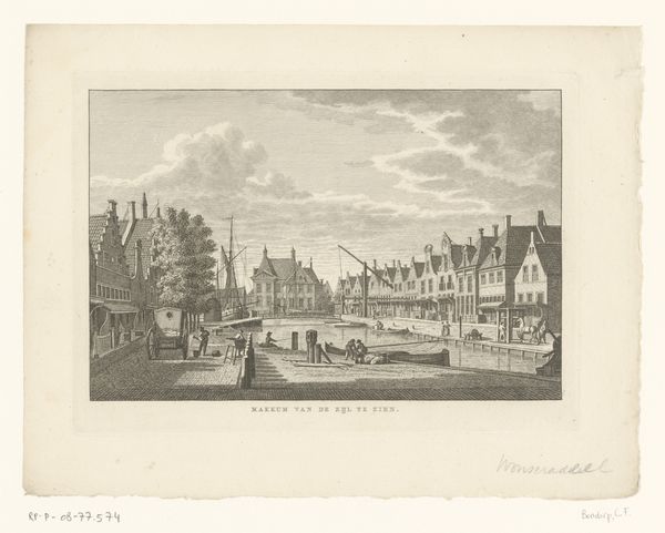 Léon Auguste Asselineau created this print, "Zicht op het gebouw van de prefectuur en de kade in Quimper," using etching and engraving techniques. The pale sepia tones establish a tranquil atmosphere, balanced by the intricate detail in the architectural and natural elements. Asselineau’s composition relies on structured arrangements. The buildings and the quay are aligned to create orthogonal lines, and the trees are positioned as counterpoints, softening the hard geometry with organic forms. The artist uses the geometric grid of the buildings and the linear perspective of the river to construct a rationalized space, a key element in the visual language of 19th-century urban representation. The fine lines and carefully modulated tones provide depth. This technique reflects a broader cultural interest in using art to capture the essence of modern life through controlled, ordered compositions. The image encourages us to consider the formal strategies through which artists represent space, structure, and the subtle interplay between nature and architecture.