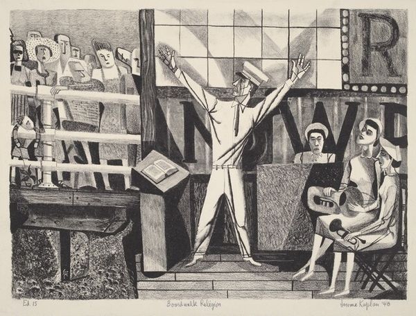 Curator: What a vibrant image of play! Editor: It feels almost chaotic, yet grounded by the tonal range achieved in graphite. Let's explore "Colonial Park" created in 1937 by Richard William Lindsey. Editor: What catches my eye immediately are these swings. Their angular structure feels repeated and a bit ominous, with the many figures vying for attention, they carry such complex social implications regarding freedom and restriction, even power dynamics. Curator: Absolutely, and it’s vital to examine the context in which Lindsey made this work. The 1930s were marked by the Great Depression, a time of immense social upheaval. This image then, is not simply a carefree snapshot of childhood, but an encoding of community resilience amidst economic hardship. Consider also racial segregation; were all children welcome in this park? This needs further research to be certain, however we must look critically at what is not present here. Editor: The graphite almost vibrates with implied energy— so full of childhood activity and almost frenetic joy—but your point raises valid questions concerning inclusivity and even privilege, if this safe play is afforded only to some? The monolithic building in the background takes on even more significance, becoming not just a building but also a looming, overseeing structure, even of social control. Curator: And Lindsey has positioned that very form as an inescapable background reality of every swing and hop made by the figures in the foreground, suggesting that the built structures influence even the smallest gesture made in the public sphere. Editor: Do you find it compelling then, as I do, that he focused on graphite rendering to evoke depth of tone and feeling? There's an inherent simplicity and everyday character of it which carries symbolic weight regarding accessibility as well, and I want to stress also that its range provides such expressive means when considering complex lived moments. Curator: I think that simplicity serves to focus on those complexities, especially if we acknowledge that within this single park scene so many narratives and exclusions could be interwoven, consciously or not by the artist himself. It reminds us to look critically at the familiar scenes from our pasts, at face value it seems nostalgic, however with context its able to offer layers to unpack regarding our contemporary political narratives. Editor: So even with what seems such ordinary imagery can resonate in profound ways with our ever-evolving perceptions. Thank you! Curator: The pleasure was all mine!