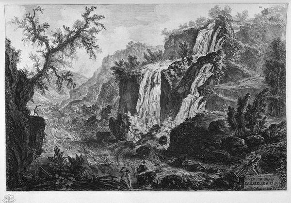 Curator: Welcome. Today, we’re looking at "Perspective of the ruins of the aqueduct," an etching by Giovanni Battista Piranesi. Editor: Immediately striking is the immense scale portrayed and how insignificant the human figures seem against this backdrop of architectural decay. There's a potent sense of time's passage and a commentary on civilization’s impermanence. Curator: Piranesi was fascinated with the grandeur of Roman antiquity, and his prints played a crucial role in shaping the 18th-century view of Rome. This particular piece is an excellent example of his vedute, or "views," capturing both the historical weight and the physical presence of Roman structures. Editor: But it's more than just a factual depiction. The composition feels manipulated, amplified, maybe even theatrical. I'm intrigued by this romantic portrayal that seemingly highlights the idea that all empires eventually decline, don’t you think? Curator: Piranesi wasn't simply recording history, but constructing a powerful visual narrative. These prints became commodities in a booming market for Grand Tour souvenirs, catering to the desires of wealthy Europeans seeking authentic experiences and souvenirs of the past. This inevitably links the work to consumption and to some extent capitalism. Editor: Precisely, and in a way, the image reflects not only on ancient Roman power but also on the colonial gaze, the way European travelers of the time interpreted, possessed, and even commodified other cultures. What would you say about his method? I am truly impressed by this level of detailing in a simple engraving medium! Curator: Piranesi was a master etcher, and this work displays the extraordinary skills for which he was celebrated. His technique involved using multiple bites of acid to create varied line weights and a complex range of textures. His use of perspective is remarkable in emphasizing scale and depth. He strategically places light and dark to create a drama, which can almost be characterized as staged! Editor: Yes, absolutely! Well, reflecting upon this work, I am led to meditate about how it reflects not only on past empires, but how our present will be observed as ruins from an uncertain future. Curator: Absolutely. Piranesi gives us not just a document of Roman architecture, but a space to confront history and our place within its ongoing narrative.
