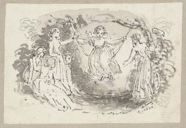 Curator: At first glance, I feel like I’m seeing some joyful revelry with figures raising their arms as if dancing in some shared ecstasy. It feels liberating, even celebratory. Editor: Indeed. What we have here is “Illustration efter Murphy: Travels in Portugal," an etching with ink on paper dating from 1748-1831, after a drawing by J.F. Clemens. It now resides at the SMK, the National Gallery of Denmark. Curator: The energy reminds me of a maypole dance or some kind of harvest festival, where gestures lift towards the sky in thanks. I immediately wonder: what exactly are they celebrating? And is there something ritualistic or ceremonial in their movement? Editor: I can certainly sense a potent mixture of social observation and cultural documentation. Portugal during this time, as viewed through outside eyes like Murphy's, was ripe for Romantic-era exoticization, with depictions that explored "quaint" local customs and folklore. Curator: This makes me ponder what this form of visual transcription might capture or perhaps misconstrue. The wizened, observing figures on the periphery offer such a potent, contrasting view of the dancers; it reminds me of age, memory, and perhaps tradition looking onto a moment of spirited youth and fleeting joy. Editor: Look closer at the symbolic contrast in how the figures are rendered: these onlookers almost melt into the earth, whereas the dancers pop with gestural vivacity. Perhaps they’re meant to evoke feelings around ephemeral youth set against an unmoving, historical landscape. Their celebration, after all, might be a tiny blip in the scope of the observing elders’ timeline. Curator: Oh, absolutely. It lends this fleeting snapshot of life a particular emotional richness—both joy and reflection meet, a dynamic tension for our attention. This contrast adds layers, doesn’t it? Editor: Precisely. It's a testament to Clemens' skill to imbue a relatively simple illustration with so much interpretive potential. These seemingly straightforward lines capture something profoundly evocative.