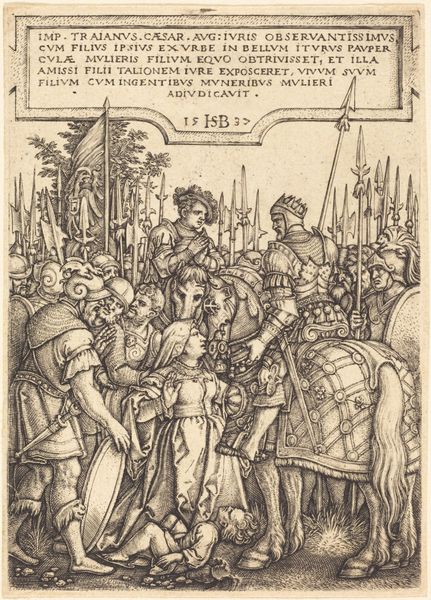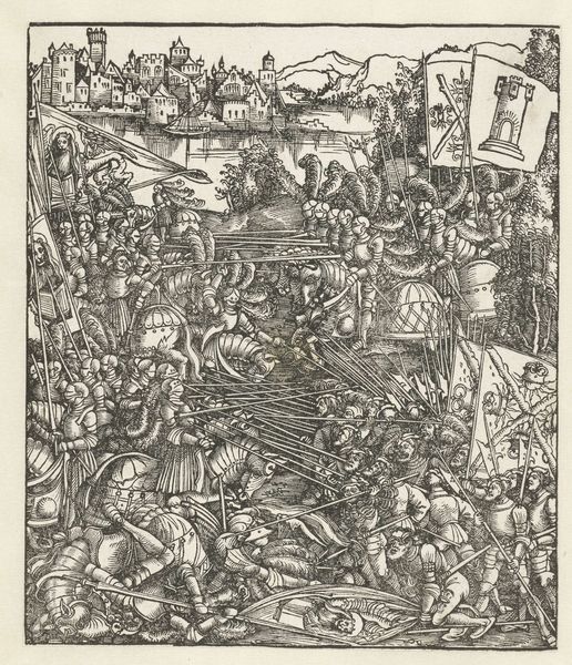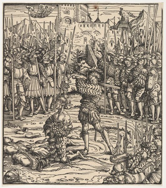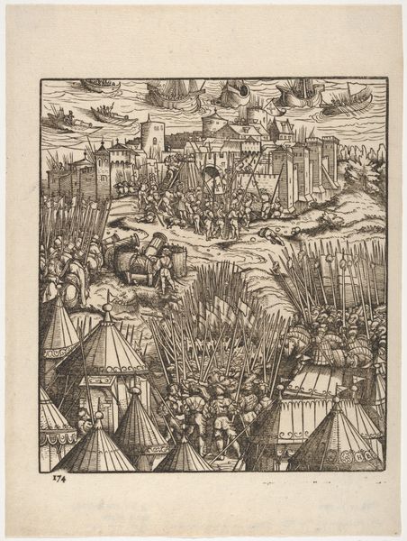 Hans Springinklee made this print of the Conquest of Stuhlweissenburg in Hungary, in around 1522, using etching and woodcut. The image shows the siege of a city, with soldiers and tents in the foreground and a detailed cityscape in the background. Prints like this one played a crucial role in shaping public opinion and spreading information during the Reformation. Germany in the 16th century was a hotbed of religious and political tension, and printed images were a powerful tool for propaganda. This print probably depicts a specific historical event, and it reflects the political and military conflicts of the time. The level of detail and the inclusion of specific architectural features suggest that it was intended to be both informative and visually impressive. To fully understand the context, we can consult contemporary chronicles, military records, and political pamphlets. By studying the social and institutional context, we can gain insight into the meaning and significance it held for its original audience.