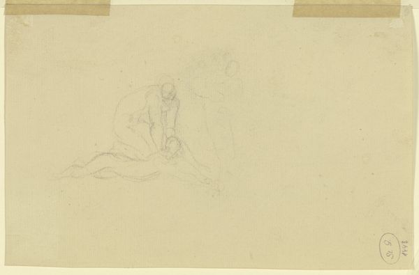 Curator: I’m struck by how tentative and dreamy Victor Müller's "Liegender weiblicher Akt in einer Landschaft, daneben eine lagernde junge Frau, diesen betrachtend" feels. Editor: It is interesting! My immediate reaction is of a half-formed memory, seen through gauze. So ephemeral and slightly haunting. Curator: It's a pencil drawing, which explains some of that. It's intriguing as the work itself seems to contemplate observation. The title translates roughly to "Reclining female nude in a landscape, next to it a reclining young woman, viewing it," setting up a sort of… gaze inception. Editor: Inception! Exactly. There is an overt layer of the woman looking at the nude, yet the work is offered for all of us to view as well, a third layer of interpretation. This makes me wonder how artworks influence public perspectives on intimacy, representation, or perhaps objectification? Does this outer frame always complicate the personal and creative expression? Curator: Good questions. What do you make of the technique? It’s like the drawing barely dares to commit, each line almost a breath. Is the hesitancy part of the narrative? Editor: Yes, there's an exquisite gentleness to the whole thing. As though Müller wanted to suggest rather than declare. There is an ethereal and almost idealized natural world in which everything is born equal, without prejudice. Curator: Do you read something academic or conventional in the depiction of the nudes, or does the sketch-like quality push against that? Editor: Tricky. There is certainly an element of idealised form, in a nod to the prevailing style perhaps? But because it feels so fleeting and personal, the “academic” label feels too fixed, doesn't allow enough fluidity and grace to exist here. Curator: I agree. And I think that's what I find so compelling about it. The work transcends expectations. Editor: It definitely opens more avenues for discussion and provokes an awareness of layers to interpretation. Curator: Ultimately, this fragile drawing serves as a beautiful meditation. Editor: It truly does, offering, despite its lightness, so much to contemplate about art, perception, and, well, gazing!