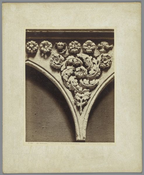 This is Adolphe Giraudon’s photographic reproduction of a relief from Notre-Dame in Caen. While Giraudon lived in a time of great social change, he became known for meticulously documenting buildings and monuments. Consider the context in which the original relief was produced. During the medieval period, the Catholic Church held immense power. Religious art often served to instruct and inspire the largely illiterate population. Architectural details, like the relief captured here, would have been integral to conveying religious narratives. The leaves carved into this piece represent the Tree of Life. Through Giraudon's lens, the tactile stone is translated into a study of light and shadow. Look at the formal qualities of the photograph itself. Its monochromatic palette and texture invite us to reflect on how we experience the past through different media. In a world increasingly reliant on digital imagery, Giraudon’s work prompts questions about authenticity, memory, and the role of art in preserving cultural heritage.