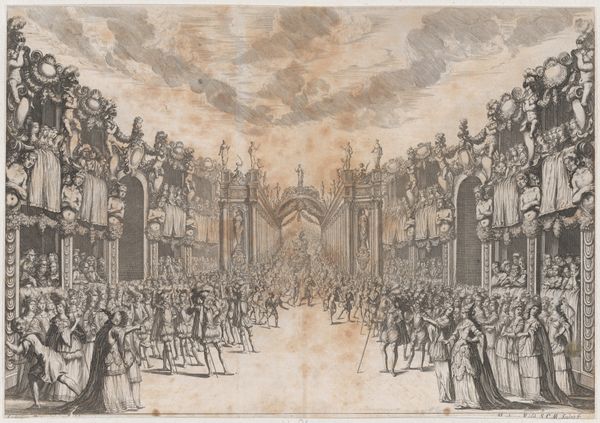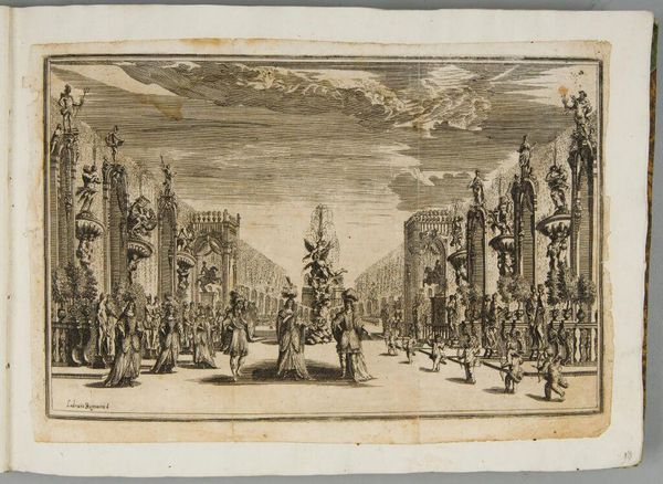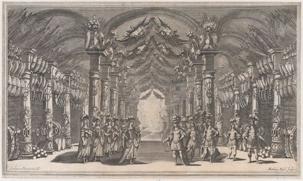 Mathäus Küsel created this etching, "Pleasure garden, with three figures in front of a fountain at center, a row of putti to the left, and a group of women to the right; set design from 'Il Pomo D'Oro'," which transports us to the opulent world of 17th-century European courtly spectacle. Küsel, working within the milieu of Baroque artistry, captures a scene that’s as much about power and display as it is about entertainment. Note the arrangement of figures: putti, women, and central characters which suggest a carefully constructed hierarchy. This set design offers a glimpse into the performance of gender, class, and identity within the aristocratic sphere. "Il Pomo D'Oro" or the golden apple, alludes to the mythical world of gods and heroes, a popular theme in courtly entertainment, used here as a symbolic backdrop of power. Consider how this image, beyond its aesthetic qualities, served to reinforce the social order, and staged the spectacle of wealth. It’s an invitation to reflect on the complex relationship between art, power, and identity in the Baroque era, reminding us of the emotional and personal investment in such displays.