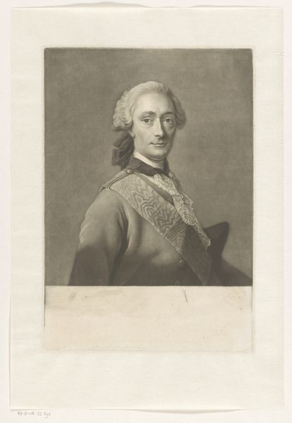 Curator: Looking at this artwork, what are your initial thoughts? Editor: Immediately, I'm struck by the textural variations achieved through etching and engraving. The velvety blacks against the almost iridescent whites—it's a study in contrasts. Curator: This is James McArdell's "Portret van Eduard van York," dating back to circa 1758-1765, currently housed in the Rijksmuseum. As the name suggests, it depicts Prince Edward, and it is made with print, etching and engraving. What about the formal elements in that context? Editor: Absolutely, we see the baroque dynamism channeled through the academic rigor of portraiture. Consider the composition: a poised figure dominates, softened only by that wispy landscape suggestion behind. The light catches his youthful face—an almost archetypal image of aristocratic power. Curator: I find myself focusing on the process of creating such prints and engravings during that time. Consider McArdell's role: he isn’t merely representing nobility but producing a commodity aimed at wider consumption. Prints like this reinforced social hierarchies. Editor: And it succeeds due to his technical skill! Notice the subtle gradations and meticulous detailing. These formal choices heighten the symbolic weight: the ornate coat speaks to privilege, the posture exudes authority, and together, the composition screams ‘prince’. Curator: I suppose that those visual symbols do operate beyond pure aesthetics. Who exactly consumes these prints and for what purpose becomes critical in interpreting McArdell's choices and how it portrays this young man. Editor: True. It does raise questions: Is this artwork designed for admiration, for propaganda, or for historical record? Likely all three. Regardless, the elegance remains undiminished even centuries later. Curator: Agreed. This glimpse into both art and society leaves me reflecting on enduring power structures subtly packaged within each line of engraving. Editor: And for me, those elegantly rendered lines continue speaking a clear aesthetic language: that of timeless royal portraiture, reinterpreted, of course, through a contemporary gaze.