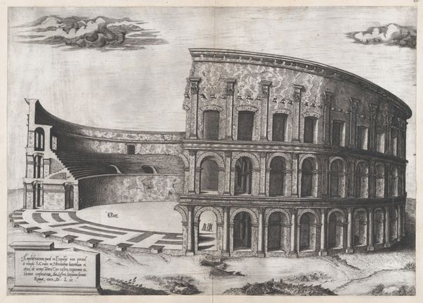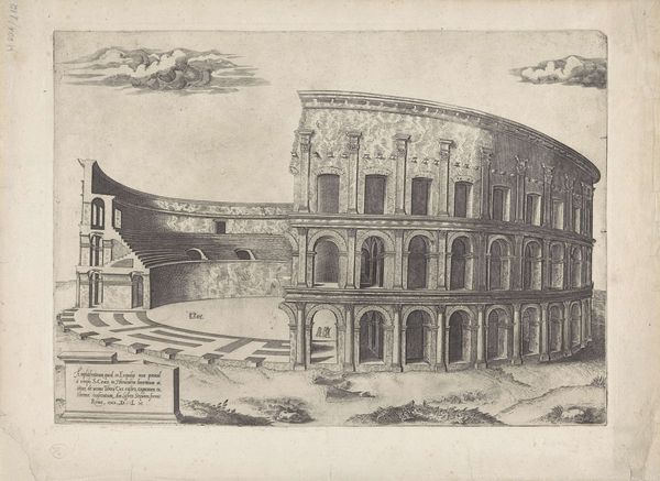 This is Pieter Schenk's depiction of the Theater van Marcellus in Rome, made sometime between 1660 and 1711. This print offers us a glimpse into the cultural fascination with classical antiquity that permeated 17th-century Europe. Schenk, through his detailed engraving, isn't just showing us the physical ruins of a Roman theater. He's inviting us to reflect on the layers of history and power embedded within this space. Originally built in ancient Rome to stage spectacles for the masses, the theater, by Schenk's time, was incorporated into the Savelli palace. Notice the figures in the foreground, they are rendered small against the vastness of the architecture, prompting considerations of individual experience against the backdrop of monumental history. The emotional experience of viewing such a place must have been charged with the weight of history and the spectacle of human achievement and decline. It’s a stage upon which power, culture, and identity have been continuously renegotiated, subtly urging us to consider who gets to write history and whose stories are told.