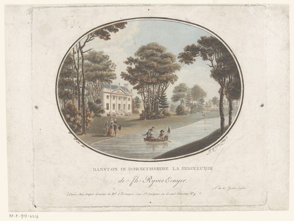 Curator: So, we have before us “Gezicht op Wilton House,” or “View of Wilton House,” created around 1788. It’s attributed to Laurent Guyot, a combination of printmaking techniques with engraving and watercolor on paper, presently held at the Rijksmuseum. Editor: Immediately, I get this almost dreamlike serenity from it, it feels contained and precious. The oval composition gives it such a vintage and charming feel, like peering through an old-fashioned looking glass. Curator: Absolutely. What interests me here is the blend of those mediums. Printmaking provides the line and structure, and the watercolor softly fills in the tones, almost a collaboration of the industrial and the individual touch. It raises the question: how widely available would such images have been, given the labour required? Editor: That's an interesting thought. Wilton House, grand as it is, becomes almost a backdrop to daily life. Notice the figures in the foreground, their casual postures almost distract from the stately home, doesn’t it suggest the nobility who possessed such privilege, while other's lives just went by as their daily chore? Curator: You know, it could be seen as an exercise in idealised living, showcasing the landed gentry against their carefully curated landscape, but the addition of hand-applied color could speak to something more personal than purely commercial interests in the engraver’s workshop. Editor: And thinking materially, those pigments, the quality of paper, and the precision of engraving speak volumes of wealth and status in its day. Every part shows someone has painstakingly laboured so they must also have worth and value behind each action of materialising this landscape, this particular image. It seems every person worked to get to this image, either by building the Wilton House or printing them so on, what I meant. Curator: I concur completely. Even the Neoclassical architecture of Wilton House reflects that aspiration for order, proportion, and idealized form that would blend harmoniously with this English landscape scene. Editor: Well, now that I’ve paused to really observe it, there's a sense of calm authority about the whole thing—the kind only immense inherited wealth provides. And it definitely puts a perspective on current architectural choices…I feel so humble just knowing the history behind this print. Curator: Precisely, by reflecting on what’s past, perhaps it encourages our eyes and thinking to ponder what we value now too. It’s a window into another world with an elegance—but a silence, also—speaking to a whole way of living.