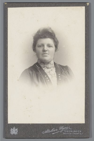This is a portrait of an unknown woman by Berend Mulder. The photograph’s sepia tones and compact dimensions create an intimate viewing experience. The subject's gaze is directed toward the viewer, establishing an immediate connection. The composition divides the space symmetrically, emphasizing the balance between the background and the subject. Mulder uses light and shadow to define the woman’s features, particularly around her eyes and hair, adding depth to the two-dimensional image. The texture of the paper, visible in its aged condition, brings a tactile quality to the visual experience, contrasting with the smooth surfaces of the woman's skin and clothing. The structured contrast between light and shadow plays with visibility and concealment, inviting us to consider the photograph as a medium that both reveals and obscures. Photography, as a semiotic system, presents not just an image but a set of codes about representation, identity, and the gaze. As such, this portrait prompts us to reflect on how we construct and interpret images of others.
