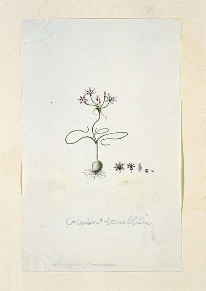Editor: This is Robert Jacob Gordon’s drawing, "Hessea cinnamomea (L'Hérit.) Durand & Schinz. (umbrella lily)", possibly from between 1777 and 1786. It appears to be rendered with watercolor and colored pencil, and I find the botanical details quite fascinating. What strikes you about this piece? Curator: Considering Gordon's position within the Dutch East India Company, this botanical illustration offers more than just scientific observation. The paper, pigments—where did they originate? How were they traded? The labor involved in their production, from mining to manufacturing, shaped this image as much as Gordon’s hand. Think about the social context intertwined within the very material of the artwork. Editor: That's interesting, I was only looking at the plant itself. So, the materials reveal something about global trade and colonial economies? Curator: Precisely. Watercolors and colored pencils were becoming increasingly accessible, fueling both scientific pursuits and artistic endeavors. Who had access to these materials, and who benefited from their distribution? Also consider that "umbrella lily" is an attributed title now -- what did indigenous populations call it? Were their uses of it documented by Gordon or other members of the company? These details inform the art object in crucial ways. Editor: I hadn’t considered that before. So, by examining the materials, their origins, and the means of production, we can uncover hidden layers of meaning related to labor and colonialism. Curator: Exactly. It compels us to question traditional hierarchies in art history, moving beyond the purely aesthetic to consider the social and economic forces that shaped the work. Editor: I've definitely learned a lot about looking at art with a materialist lens today! Curator: Me too. Thinking about how this botanical illustration became an instrument of colonialism and commerce gives me a new framework for understanding art objects!