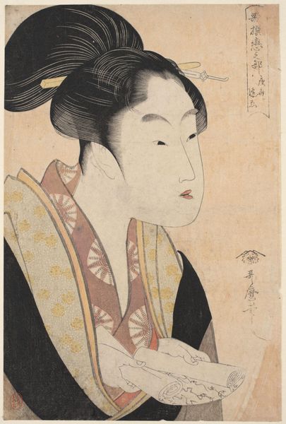 This is "The geisha Kamekichi," a woodblock print by Kitagawa Utamaro. The elegant curves and flat planes in this portrait create an alluring yet restrained composition. Her posture, with clasped hands, suggests a moment of introspective contemplation, while the soft palette of muted browns, creams, and blacks, reinforces this sense of quiet intimacy. Utamaro's use of line is particularly striking. Notice the delicate lines that define the geisha's features, hair ornaments and garment. This use of line contrasts with the flat, unmodulated colour planes of the face and clothing. There's a subtle interplay between traditional representation and symbolic abstraction at work. In contrast to Western conventions, where the goal is often to create an illusion of three-dimensionality, this print embraces a more stylized aesthetic. The print flattens and simplifies the figure to emphasize its essential form. This piece invites us to consider how traditional signs and symbols are employed and how they can function as a sophisticated visual language. Ultimately, this piece challenges viewers to move beyond the surface of the artwork and explore the deeper cultural and philosophical meanings embedded within its structure and composition.
