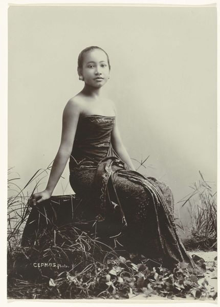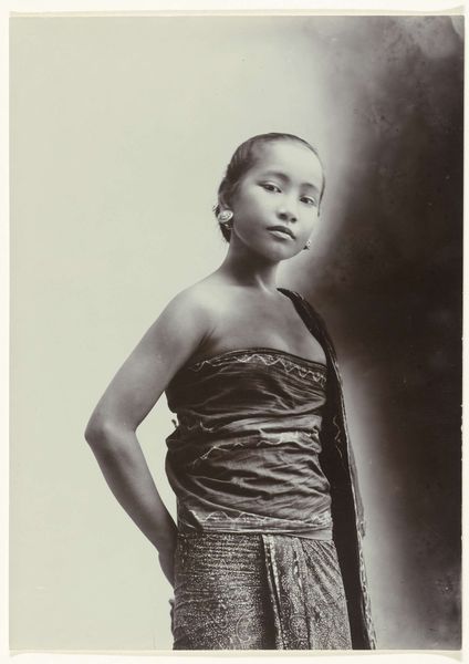 This is a studio portrait made by Kassian Céphas, a Javanese photographer, of a young woman, likely taken in the late 19th or early 20th century. The woman is seated, and the composition is structured around the interplay of textures and patterns. The batik motif of her sarong contrasts with the plain background, drawing the eye across the image. Light and shadow define the contours of her form, emphasizing the drape of the fabric and the smoothness of her skin. Beyond its aesthetic qualities, the photograph invites us to consider the semiotics of colonial representation. Céphas, as a Javanese photographer, was navigating a complex cultural landscape. The Western gaze often exoticized and objectified non-Western subjects. This image, with its formal composition and careful attention to detail, engages with and possibly subverts these expectations. The soft sepia tones and diffused light create a sense of intimacy, inviting the viewer to contemplate the woman's presence and identity. Ultimately, the photograph is a testament to the power of visual representation. It serves as both a historical record and a reflection on the dynamics of culture and identity.