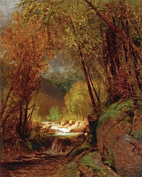 Editor: We’re looking at "The Emerald Pool" painted by Albert Bierstadt around 1870. It's an oil painting showing a mountain landscape reflected in a still pool of water. There's something so serene and picturesque about the scene, a real invitation into the wilderness. How do you read this artwork? Curator: For me, Bierstadt’s landscapes are like poems. He paints not just what he sees but what he *feels* about the land. There's this immense romanticism; you almost want to *be* inside that emerald pool, right? He heightens the drama with that contrasting light – dark forest in the foreground, brilliant mountain peaks beyond. Do you sense any narrative in the composition? Editor: I think the light does create a certain drama. The mountain seems so distant. Narrative… hmm, I suppose the journey towards that distant light, maybe? Curator: Exactly! These paintings weren't just pretty pictures. They spoke to the ambition of westward expansion in America at the time. Think of that distant mountain as a metaphor - challenging but filled with promise. Editor: Oh, I never thought of it like that! I was too caught up in the pretty colors. Curator: Art’s sneaky like that! But also, let’s not lose sight of the sheer artistic skill here. Look at how Bierstadt handles the reflection in the pool – almost mirror-like. He must have spent hours observing water in real life. He wants to convince us to feel like *we* are seeing something grand! What are your thoughts now? Editor: I'm definitely seeing much more to it now than just a pretty landscape! I see a journey, a cultural narrative, a skill…it’s a lot! Curator: It is a lot! But isn't that why art's so wonderful? There's always more to discover. For me, I am going to go on more walks through forests this autumn!