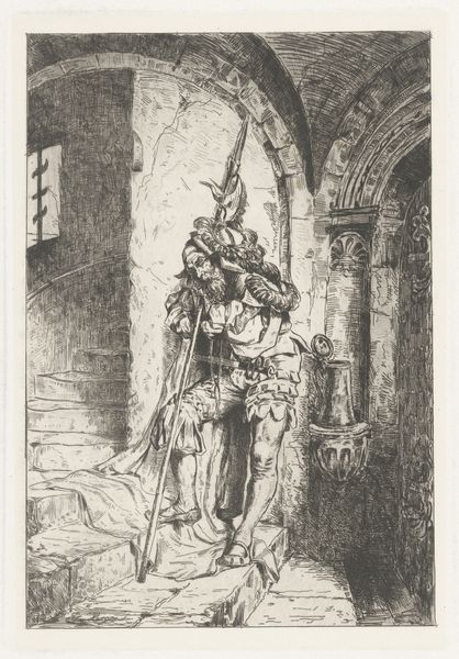 Charles Rochussen rendered this watercolor artwork, “Ridder Johan van Brederode XV in een interieur,” depicting a knight within an interior. Dominating the scene is the figure of the knight, adorned in period attire, alongside the symbolic presence of his armor, sword, and a heraldic banner bearing a lion rampant. The lion, a recurring motif throughout history, has been a potent symbol of courage, nobility, and royal power. From ancient Mesopotamian carvings to the medieval heraldry seen here, the lion embodies strength and valor. This symbol resonates deeply, evoking primal associations of leadership and protection, tracing back to early tribal totems. The knight’s contemplative posture, set against these martial symbols, evokes a potent psychological tension. His cross-armed stance and downcast gaze create a sense of introspection, perhaps hinting at the burdens of leadership or the weight of responsibility. Such gestures engage our subconscious, triggering associations with inner conflict and self-reflection, a timeless element in the human experience. The image encapsulates a cycle of heroism, duty, and the personal struggles inherent in upholding such ideals, continuously resurfacing in art and culture.