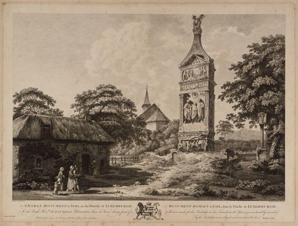 Editor: So, this is William Pars' "A Roman Monument at Igel in the Dutchy of Luxemburgh." It's a watercolor, and the scene has a gentle, almost dreamy quality, but also feels historically distant. What strikes you about it? Curator: William Pars, bless his curious heart! For me, it's the monument's stoic presence amidst the everyday – the figures strolling by, the quaint building nearby. It's like history observing the present, or perhaps, the present trying to make sense of history. Does that resonate with you at all? Editor: It does, now that you mention it. It feels like two different worlds coexisting. Curator: Exactly! And isn’t that the delicious tension of art? It invites us to ponder, to connect, to feel something beyond the purely visual. It's history, filtered through Pars' own lens, isn't it? Editor: Definitely gives me a new appreciation for historical landscapes. Thanks! Curator: My pleasure! It’s always fascinating to see how artists like Pars can bridge the centuries with a simple watercolor.