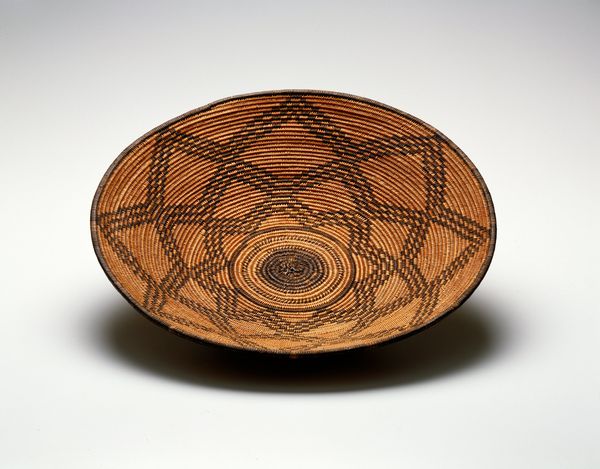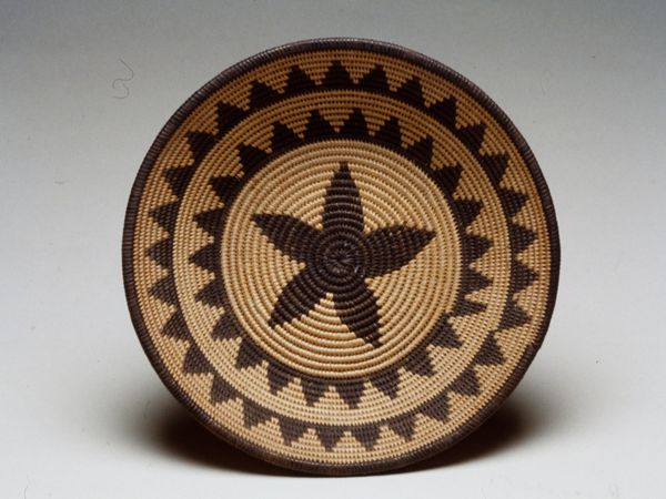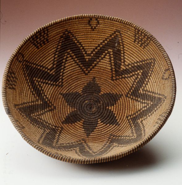 This basket was woven by an Indé (Apache) artist using natural fibers. Observe the striking star motif, a radiant symbol central to many cultures. The star, often associated with guidance, destiny, and the divine, appears in ancient Mesopotamian art, guiding kings, and on Renaissance maps, charting the unknown. Here, within the context of Apache artistry, the star may carry specific cultural meanings related to cosmology, spirituality, or tribal identity. Notice how the star is not static but dynamic, with rays that seem to pulsate outward, a visual echo of life’s energies. Such patterns may have served as talismans, designed to protect and empower. Consider the basket's function: a vessel for sustenance. The star, then, might not only represent celestial guidance but also earthly provision, grounding the cosmic in the everyday. These motifs reflect a profound connection between humanity, nature, and the cosmos.