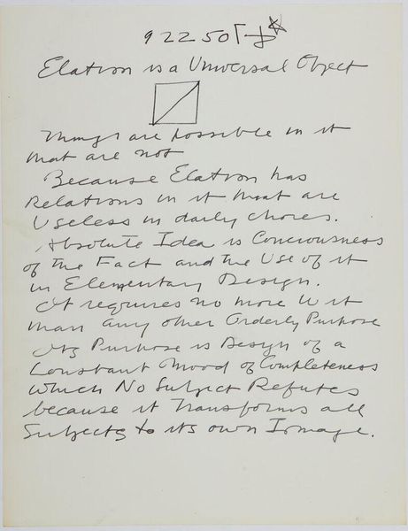 Editor: This is "Art Theory Text with Sketch" by Stuart Davis. It looks like a handwritten page of notes. The text is dense and thought-provoking, almost like a manifesto. What do you see in this piece, beyond just the words? Curator: I see Davis grappling with the very essence of artmaking, positioning "the thing" – the subject, the object – within a dialectic of subjectivity and negation. How does the "drag," this inherent friction, inform his creative process, especially considering the socio-political climate he navigated? Editor: So, the difficulty *is* the point? Curator: Perhaps. It's a resistance against easy answers, a push toward a more authentic, albeit challenging, artistic expression. How does this resonate with contemporary dialogues around artistic intention and accessibility? Editor: It really makes me rethink the artist's role in challenging the status quo. Curator: Exactly. Davis invites us to consider art as a site of constant negotiation and re-evaluation.