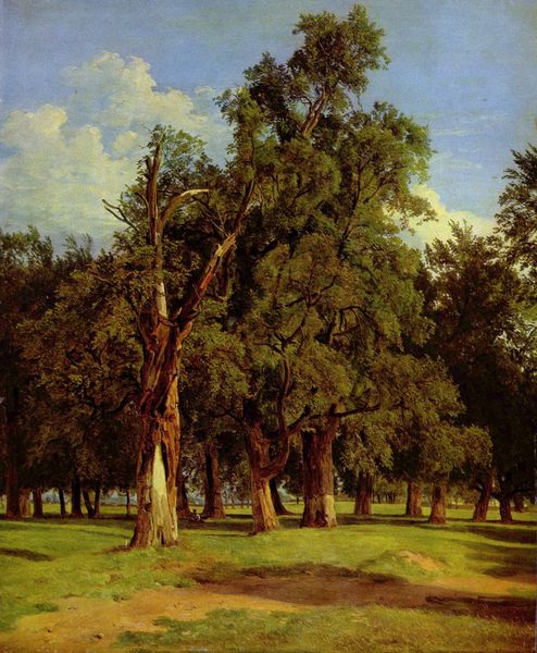 Editor: So, this is Albert Bierstadt's "Pioneers of the Woods," painted in 1858. It's oil on canvas, and the overall impression is…majestic. The trees are so large and imposing, almost like sentinels. How do you interpret this work, especially considering the title? Curator: It’s easy to see this through the lens of Manifest Destiny. Bierstadt was working at a time of massive westward expansion in the United States, fueled by a belief that it was the nation's God-given right to expand across the continent. What do you think the artist is communicating through his emphasis on light and scale in a landscape like this? Editor: The way the light breaks through the trees almost feels like a divine blessing on the landscape, suggesting opportunity and perhaps even a justification for westward expansion. It's almost like these pioneers were ordained to be here. But doesn't romanticizing this landscape obscure the very real displacement and violence enacted upon Native populations? Curator: Precisely. These paintings weren't neutral depictions; they actively contributed to the cultural narrative supporting expansion. Bierstadt’s works and others from the Hudson River School are beautiful but complicit in justifying a specific historical trajectory and shaping an idea of the ‘American landscape’. Considering that art patrons at that time were often involved in westward expansion and its industries, do you see a connection? Editor: It is hard to look away from the patrons… Their tastes actively reinforced these depictions as symbols of progress and the value of taming untouched wilderness. This highlights that these landscape paintings served not just as pretty pictures, but as potent tools in shaping and supporting policies about land and resource ownership, right? Curator: Absolutely. By examining the historical context and the patrons' investments, we reveal the ideological underpinnings of what initially appears as a serene, almost untouched landscape painting. It prompts us to think critically about how landscapes, art and political motives intersected. Editor: I see that this painting carries such complex socio-political layers behind what seems like simple appreciation of the outdoors. It definitely gave me some things to consider!