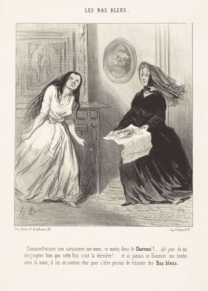 Curator: Let’s turn our attention to Honoré Daumier’s lithograph from the 19th century, "Quand des femmes savent avoir..." a work rich in social commentary and artistic flair. Editor: My initial impression is a dance of shadows. It captures the very air of a Parisian street corner, wouldn’t you agree? I love the angular posture of the lady in the front! Curator: Precisely! Note the strategic use of line weight and density to model form and convey the dynamism of the scene. Daumier masterfully employs contrast. The lithographic stone facilitates the immediacy of expression, essential for caricature. Editor: It really speaks volumes without screaming. And these aren’t just ladies out for a stroll; their presence has, shall we say, *authority.* They own the street. The one on the right looks like she's just delivered a devastating remark and expects you to absorb the critique. Curator: Absolutely. The Romanticist element is strong. There's this keen engagement with modern life and the nuances of social interactions—elevating even genre-painting. Consider also the architecture behind the women. It places them within a specifically urban and contemporary framework. Editor: To me, it’s about capturing a moment—a narrative unfolding right before us, filled with a unique sense of the ladies' dignity. Like a beautifully orchestrated snippet of city life that winks knowingly at us. The woman at the front has the air of royalty, the curve of the garment makes me think of peacock feathers. Curator: Indeed, the interplay between formal structure and narrative content in Daumier’s oeuvre often offers potent reflections on societal structures. What is powerful about the work, finally, is that each mark feels carefully planned to convey emotion and form a whole visual language. Editor: Ultimately, this lithograph pulls us in and makes us want to be a part of this world, feel the street underneath, or hear what other remarks the women would share. And that to me, is brilliant. Curator: It’s the balance between his artistic touch and his sharp social observations. An excellent reminder to engage both our critical eye and our empathetic heart.
